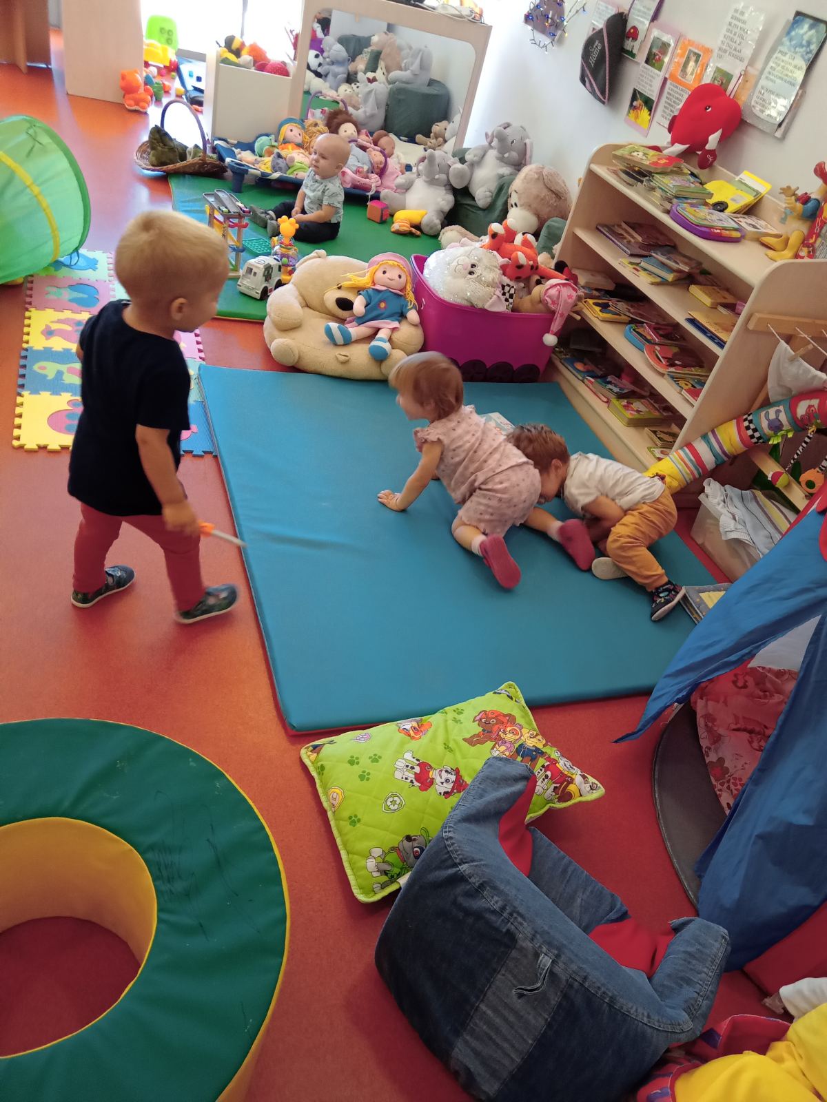 Onda mi: bojamo,slažemo,šaramo,nižemo,otiskujemo,gužvamo,ubacujemo,izbacujemo,punimo,praznimo,rastavljamo,sastavljamo… RAZBACAMO PA POSPREMAMO!!!! Slušamo priče i brojalice,a uz ritam glazbe i pjesme zaplešemo. Igramo se s lutkama, loptama,kockama…. Puzimo,provlačimo se,penjemo i spuštamo, skačemo i trčimo. Na vanjskom prostoru se igramo i družimo s prijateljima iz skupine Zvjezdice. Uglavnom, mi sve moramo opipati, pomirisati, kušati“žvaknuti“, vidjeti i isprobati. Svaki dan vježbamo sami skidanje papuča, pranje ruku te uzimanje obroka i napitka.